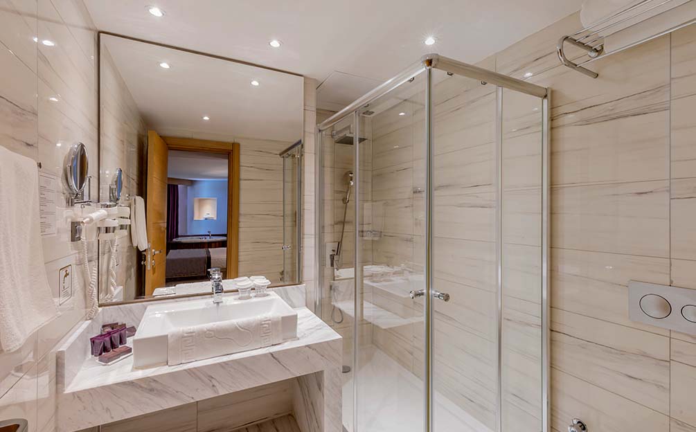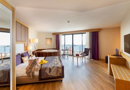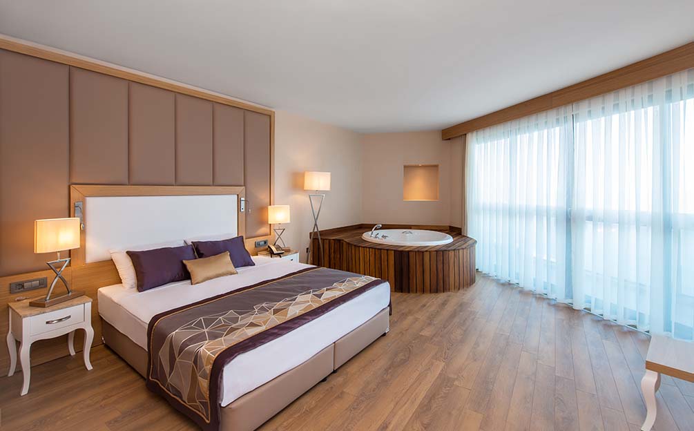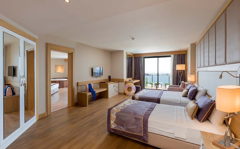 Suit odalarımız balkon dahil 100 m2 dir.Özel düzenlenmiş 2 yatak odası, 2 banyo ve balkondan oluşan odadır. Odada 2 adet çift kişilik yatak, 1 adet tek kişilik yatak ve açılabilen koltuk bulunmaktadır.